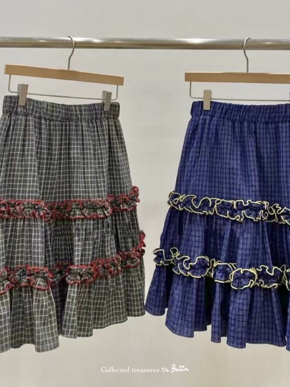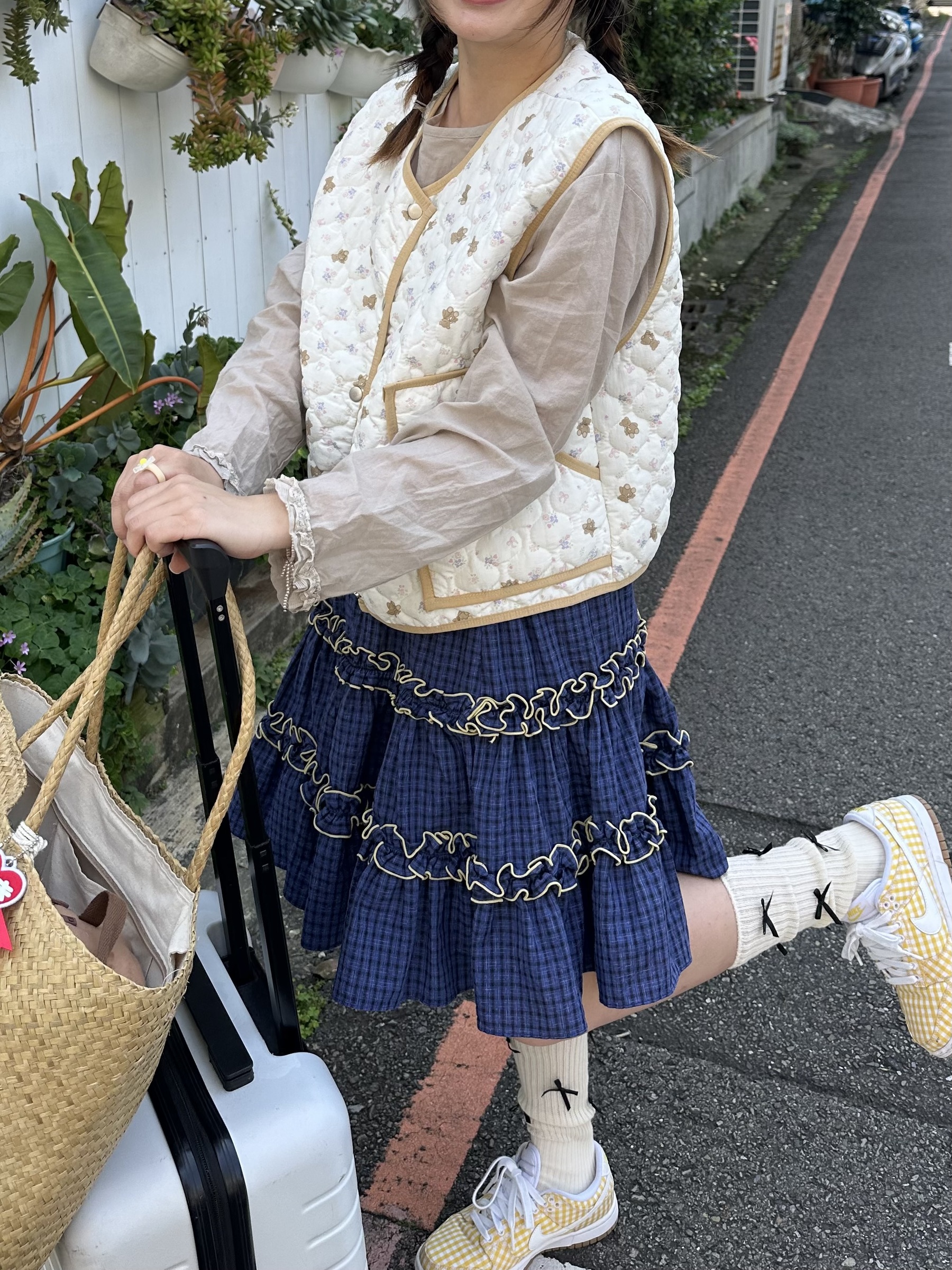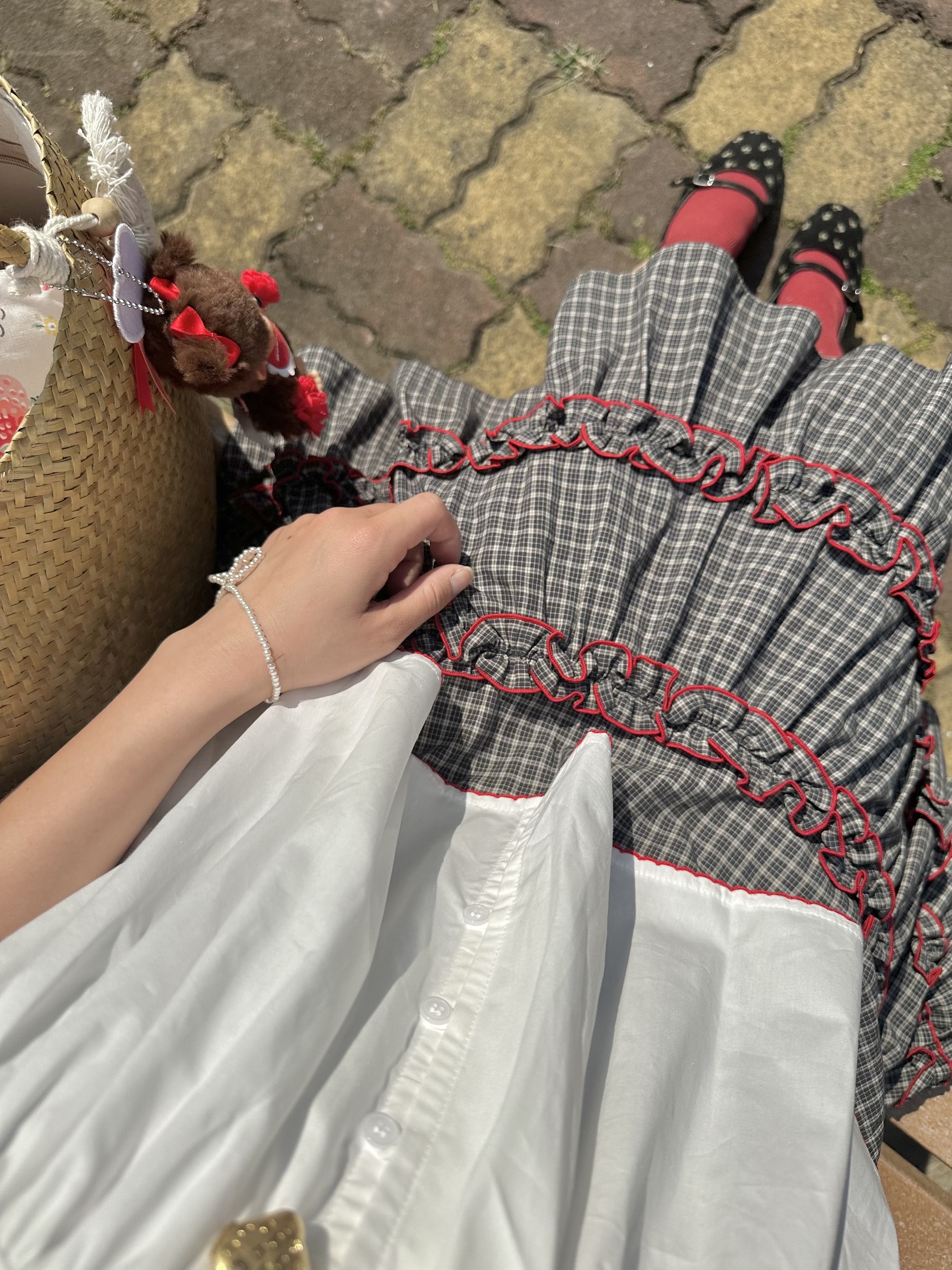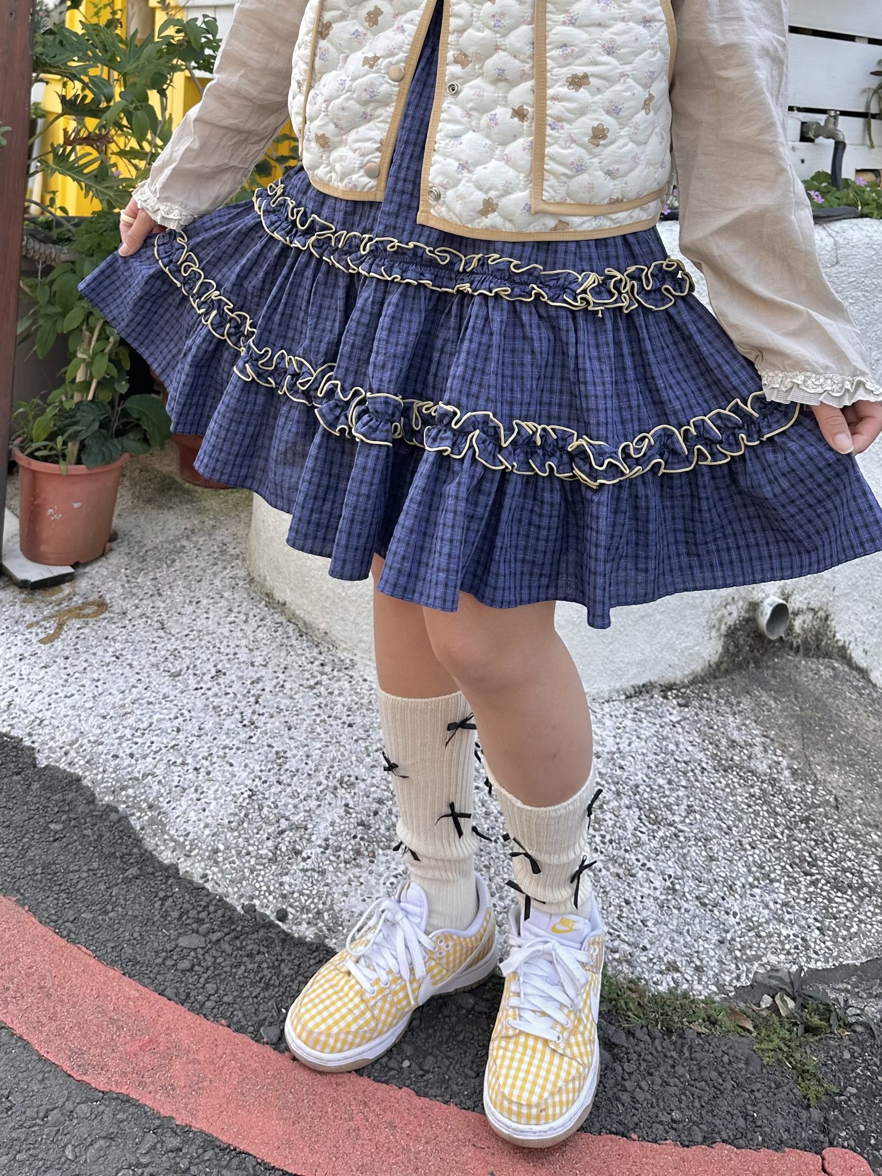 初春野餐日🧺木耳緞帶拼接格紋裙(2colors)